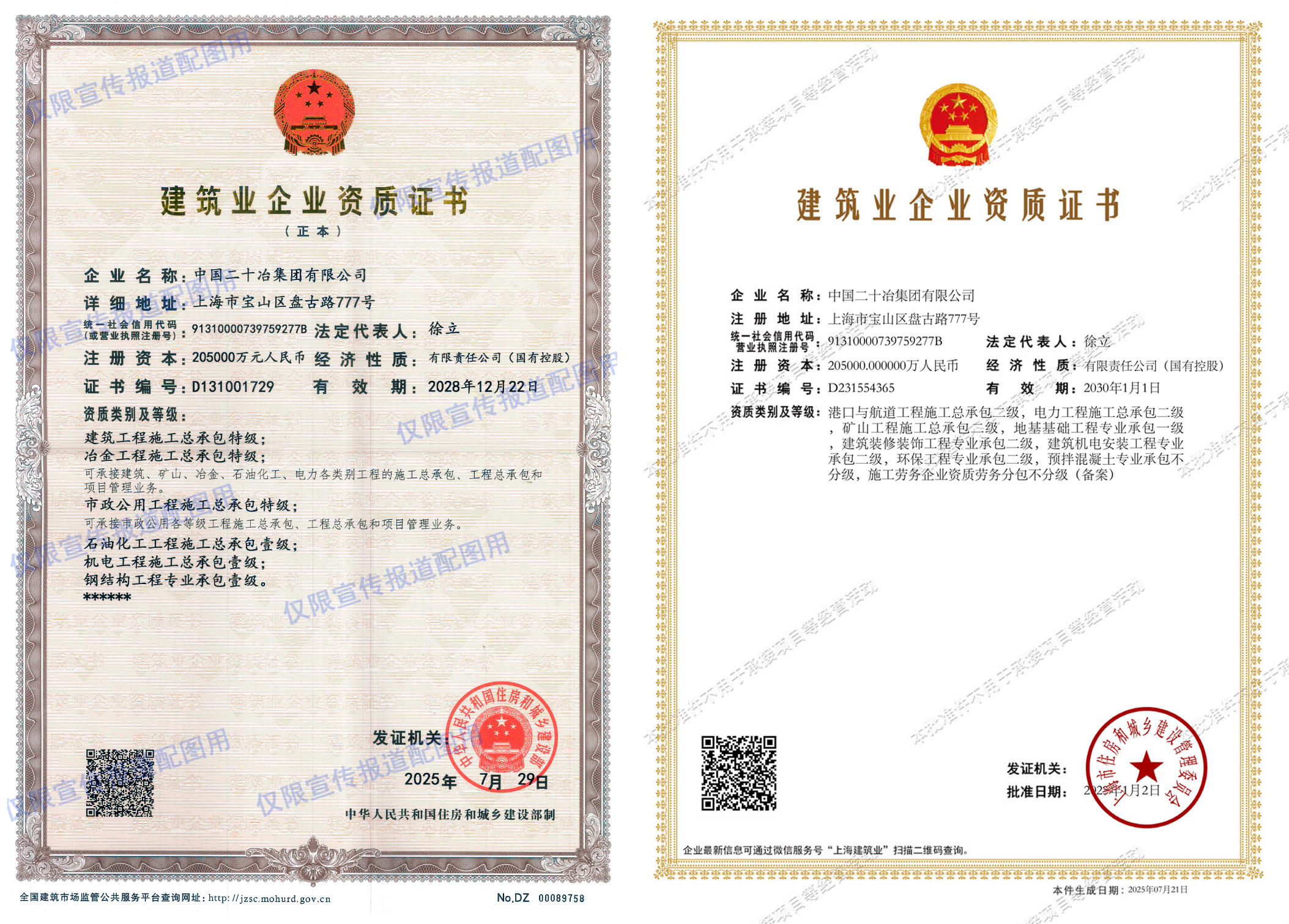 截至目前,中國(guó)二十冶共19項(xiàng)建筑業(yè)企業(yè)資質(zhì)已全部通過新一輪延續(xù)審查,建筑工程施工總承包特級(jí)、冶金工程施工總承包特級(jí)等10項(xiàng)住建部審批資質(zhì)(含設(shè)計(jì)資質(zhì)),有效期至2028年12月22日。港口與航道工程施工總承包二級(jí)、電力工程施工總承包二級(jí)等9項(xiàng)上海市住建委審批資質(zhì),有效期至2030年1月1日。