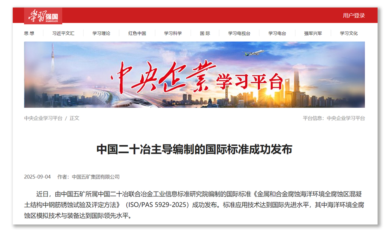 9月5日,中國(guó)五礦外部門(mén)戶(hù)網(wǎng)站轉(zhuǎn)發(fā)“學(xué)習(xí)強(qiáng)國(guó)”央企聯(lián)播欄目報(bào)道的《中國(guó)二十冶主導(dǎo)編制的國(guó)際標(biāo)準(zhǔn)成功發(fā)布》。近日,中國(guó)五礦及中國(guó)中冶多個(gè)媒體平臺(tái)相繼宣傳了此項(xiàng)國(guó)際標(biāo)準(zhǔn)。